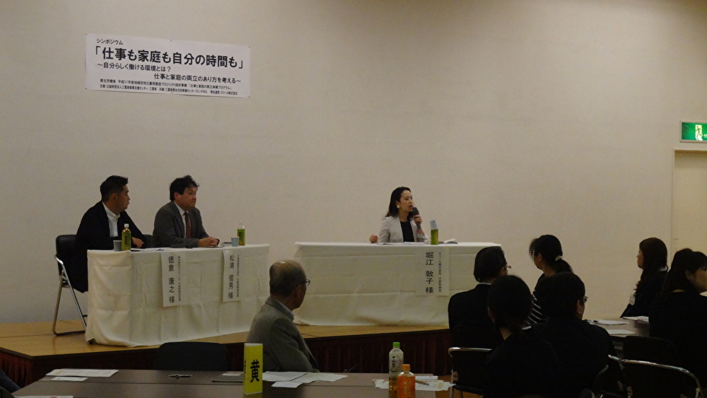 第1部は、働き方について先進的な取組を行っている企業からゲストをお招きし、代表 堀江とともに、誰もが働きやすい職場についてのトークセッションを行いました。