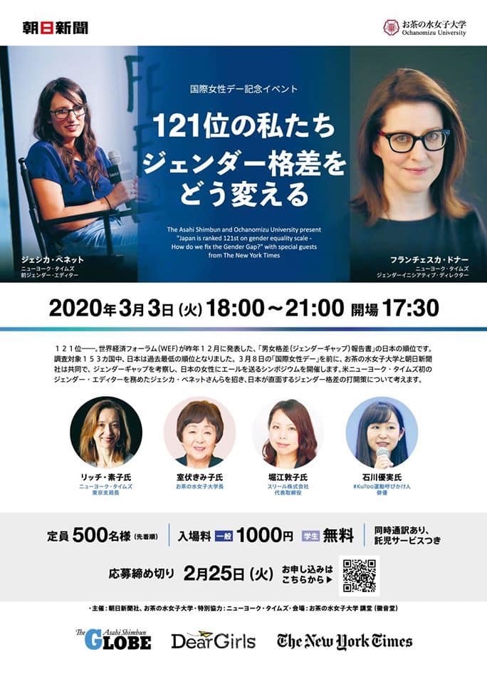 3月3日(火)に開催予定の国際女性デー記念イベント『121位の私たち~ジェンダー格差をどう変える』は、新型コロナウィルスの感染拡大のリスクを考慮し、延期となりました。
