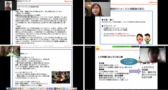 後半では、“提案されたアイディアを実現に近づけるためにできること”をテーマにオンライン上で2つのグループに分かれて、学生たちのそれぞれの提案について意見交換をしました。