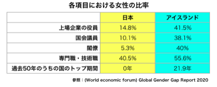 ジェンダーギャップ指数を発表している世界経済フォーラムのデータによると、日本とアイスランドには政治、経済分野でこれだけの差がありました。(項目一部抜粋)