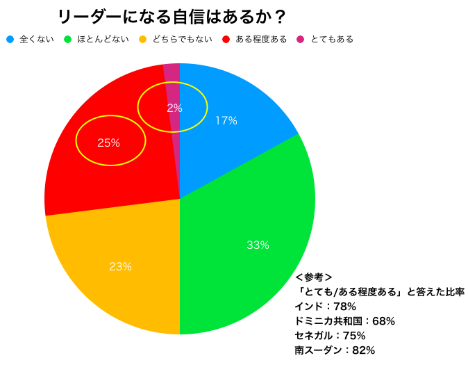 国の発展度合い、文化などの前提状況が大きく違いますが、日本では女性がリーダーになることへの励ましが他と比べ少ないことからも、女性がリーダーになる自信を失ってしまっているとも言えるのではないでしょうか。