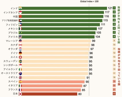 ソーシャルネットワークサービス企業の調査が、世界22カ国を対象に「仕事で成功する自信」に関する調査を行った結果、日本は男女共に平均より2割も低く、調査対象国の中では最も低いことが分かりました。さらに、日本の女性は男性より7.5%低い結果となっており、周りに比べても自信がないことが浮き彫りとなりました。(「100」を自信の基準得点としており、得点が高いほど、その市場に暮らす人々がより強い自信を持っていることを表しています。)