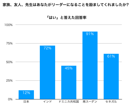 ”リーダーになる自信を持っているか?”の質問に対し、他の調査対象国の平均76%の一方で、日本の女性は27%。また、”家族、友人、先生はあなたがリーダーになることを 励ましてくれましたか?”との質問に対しても、「はい」と答えた比率は他の調査対象国よりも低い結果でした。