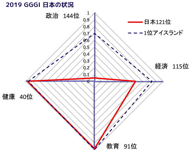 結果は過去最低の121位(153カ国中)と、先進国の中でもアジアの中でも最低順位でした。比較軸となる経済、教育、健康、政治のうち最も世界平均と差が開いているのが、”経済(管理職の男女比など)”と”政治(国会議員の男女比など)”でした。