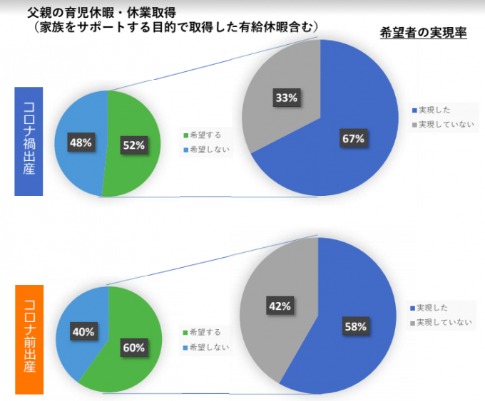 一方、コロナ禍において実現率が唯一上回ったのは、「父親の育休取得」でした。
