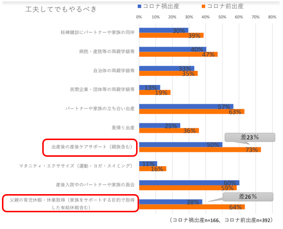 一方で、コロナ禍での出産に対し、コロナ前の出産での希望率が目立って高かったものは「産後のサポート」と「父親の育休取得」でした。その差は実に20%以上あります。これは、産前には気づいていなかったが、実際に出産を経験してみて重要と感じているものが「産後のサポート」と「父親の育休取得」であるということです。