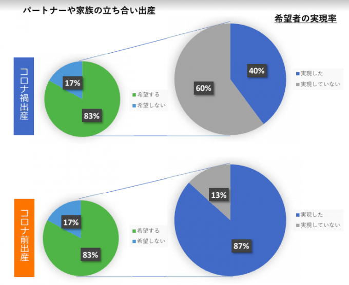 子どもの一生に一度の誕生の瞬間、お腹の中で育ってきた命との初めて対面である立ち合い出産も、コロナ前では希望者率と実現率に違いはなかったのに対し、コロナ禍での出産では希望者の半分しか実現できていないことが分かりました。入院から出産、退院までの間にパートナーや家族に一度も会えない状況になっている妊婦さんも多く、特に初めてのお産の場合大きな不安を感じながらのお産になっています。産院によっては、人数制限を掛けながら立ち合いを実施できるようにしている場所や、LINEなどを利用してオンラインでの立ち合いを実現していることもあります。