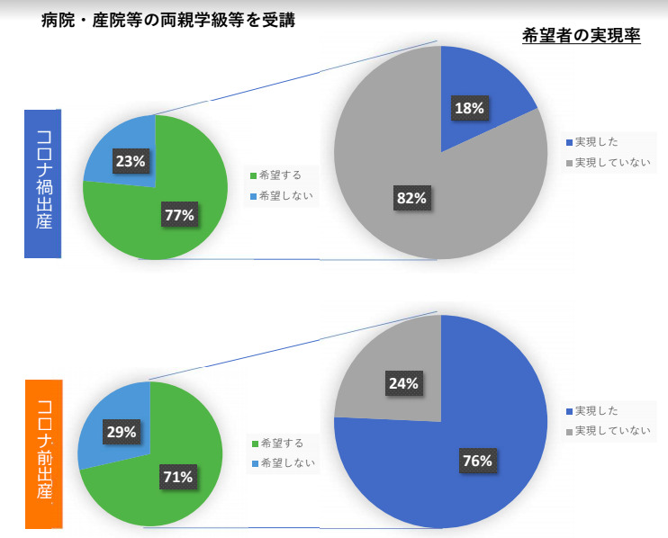 一例として、検診同伴不可、両親学級の開催がない、立会い不可、面会不可など、希望される妊婦さんはコロナ前とほぼ同じ割合なのに対し、実際に希望が叶った割合はコロナ禍出産では歴然と低いことが見て取れます。