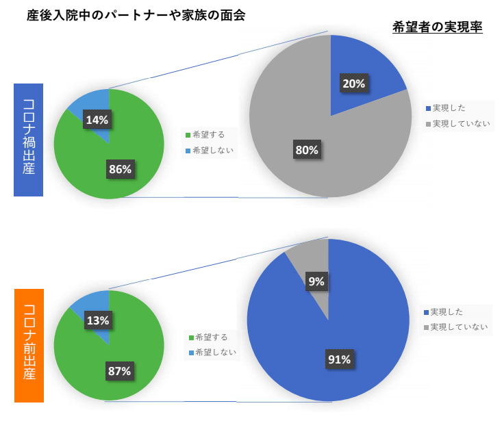 1日1日と顔が変わり、成長していく赤ちゃん。家族であれば毎日でも会いたいと思うはずですが、こちらもコロナ前の出産では希望者率と実現率に違いはなかったのに対し、コロナ禍での出産では希望者の2割しか実現できていないことが分かりました。