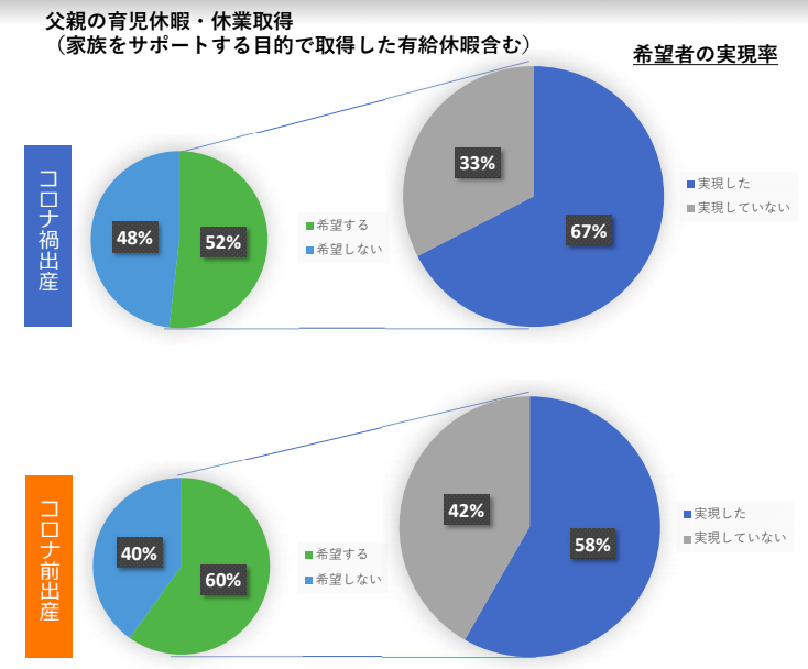 一方、コロナ禍において実現率が唯一上回ったのは、「父親の育休取得」でした。