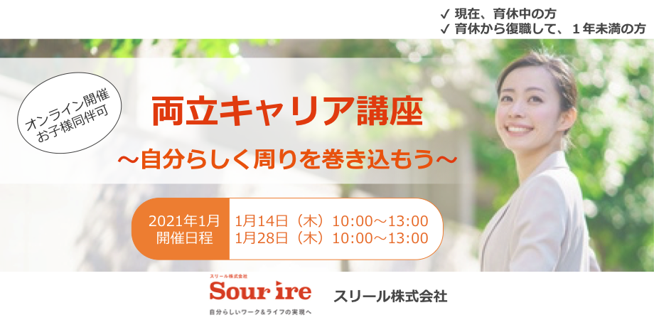 ◼︎セミナー詳細 ・日時:2021年1月14日(木)10:00 – 13:00 ・参加費:お一人4,000円 ・対象:育休中または復職1年未満の方(催行人数:2名〜) ・内容: