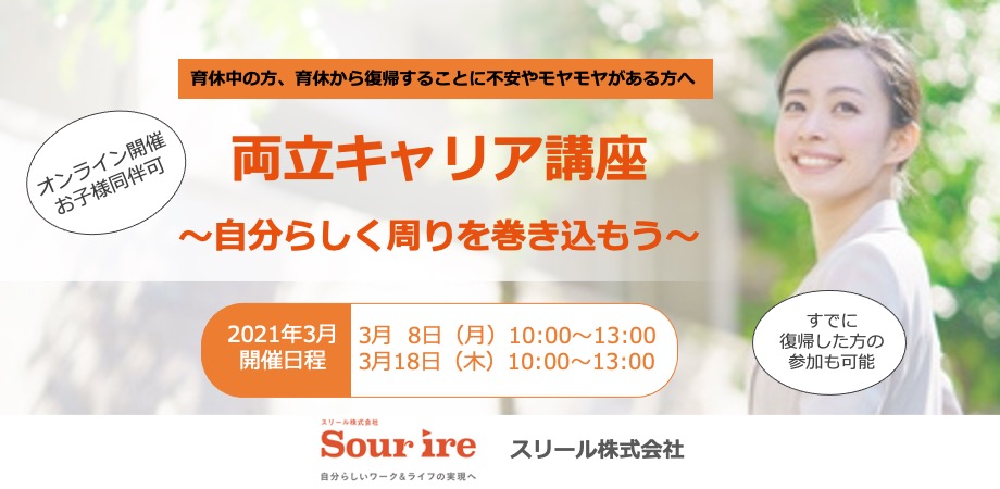 ◼︎セミナー詳細 ・日時:2021年3月8日(月)10:00 – 13:00 ・参加費:お一人4,000円 ・対象:育休中または復職1年未満の方(催行人数:2名〜) ・内容: