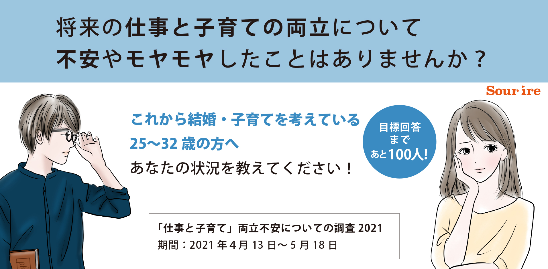 現在実施中の「仕事と⼦育ての不安やモヤモヤ」に関するアンケートについて、皆さまのご協力によって、あと目標回答数まで100人となりました!ご回答まだの方、ぜひあなたの声を聞かせてください!