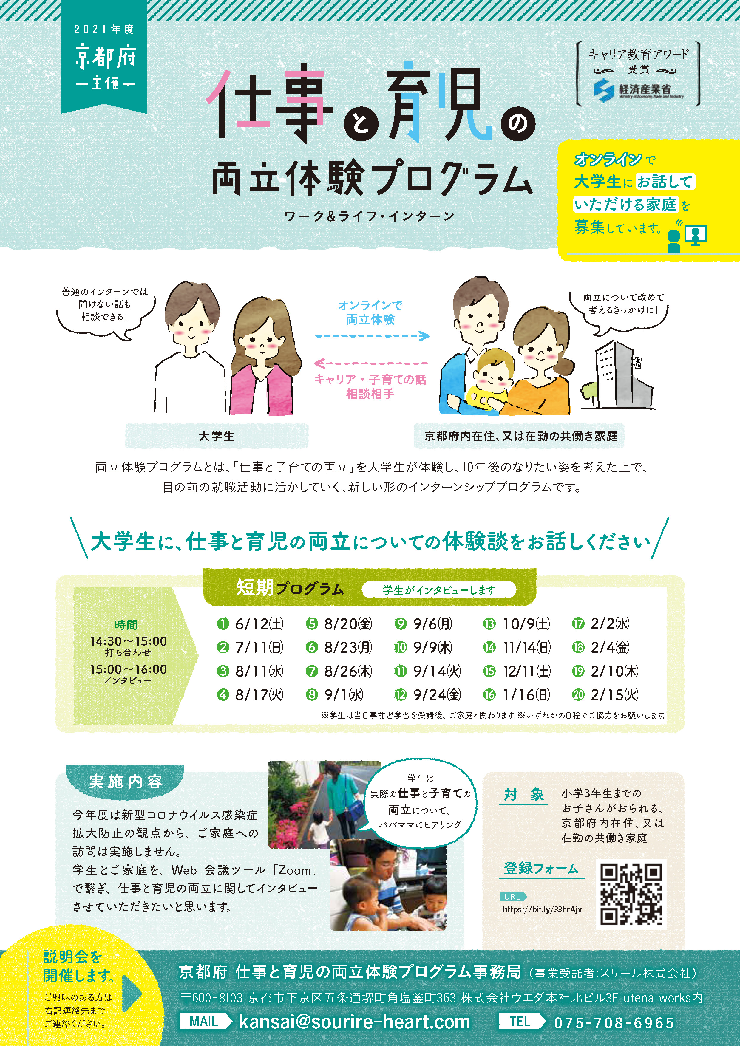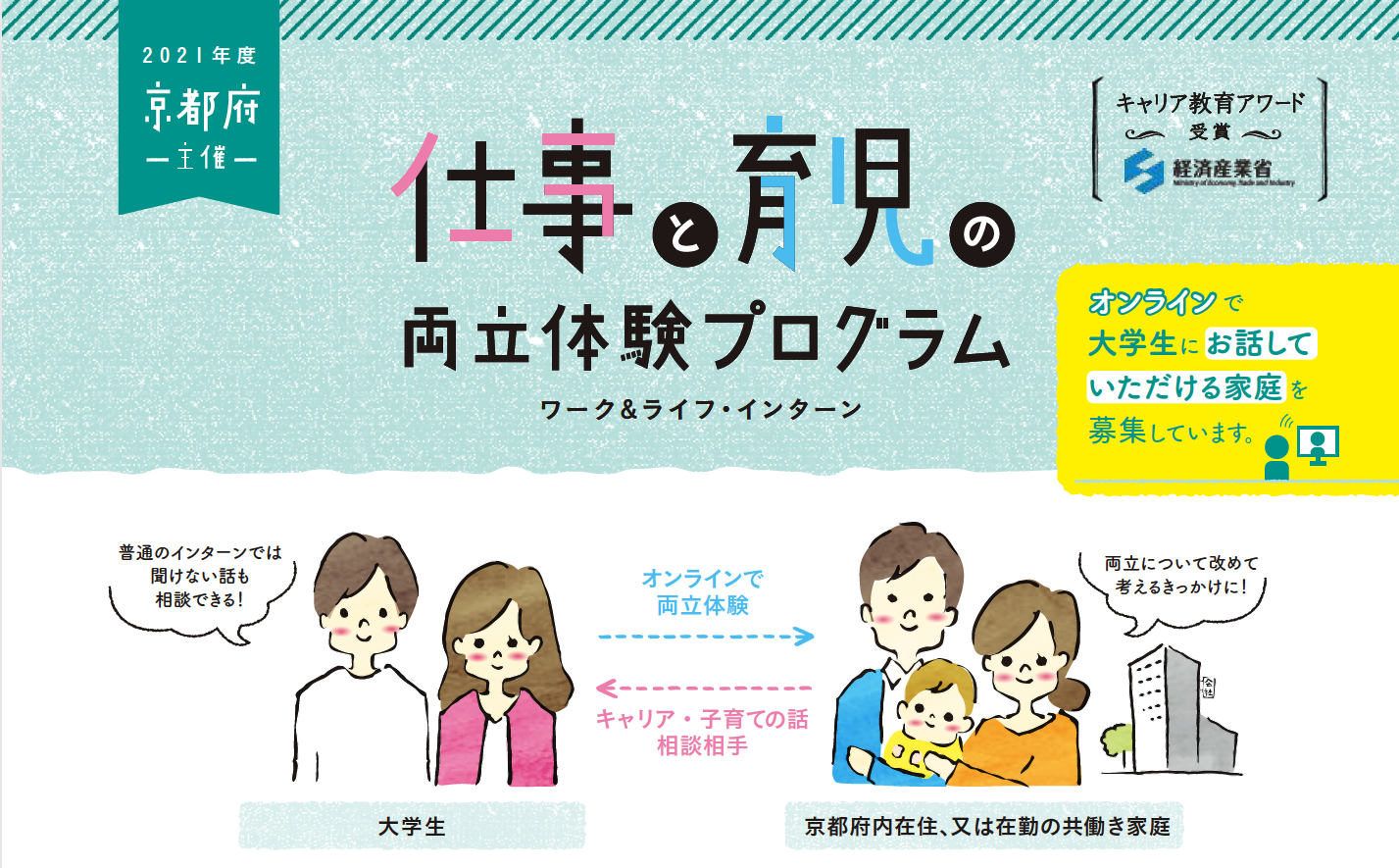 今年も、京都府主催のワーク&ライフ・インターン事業「仕事と育児の両立体験プログラム」の実施が決まりました!そこで、大学生に向けて、ご家庭のリアルな状況や、仕事と育児の両立について、体験談をお話ししていただけるご家庭を募集しています。オンラインでの実施です。