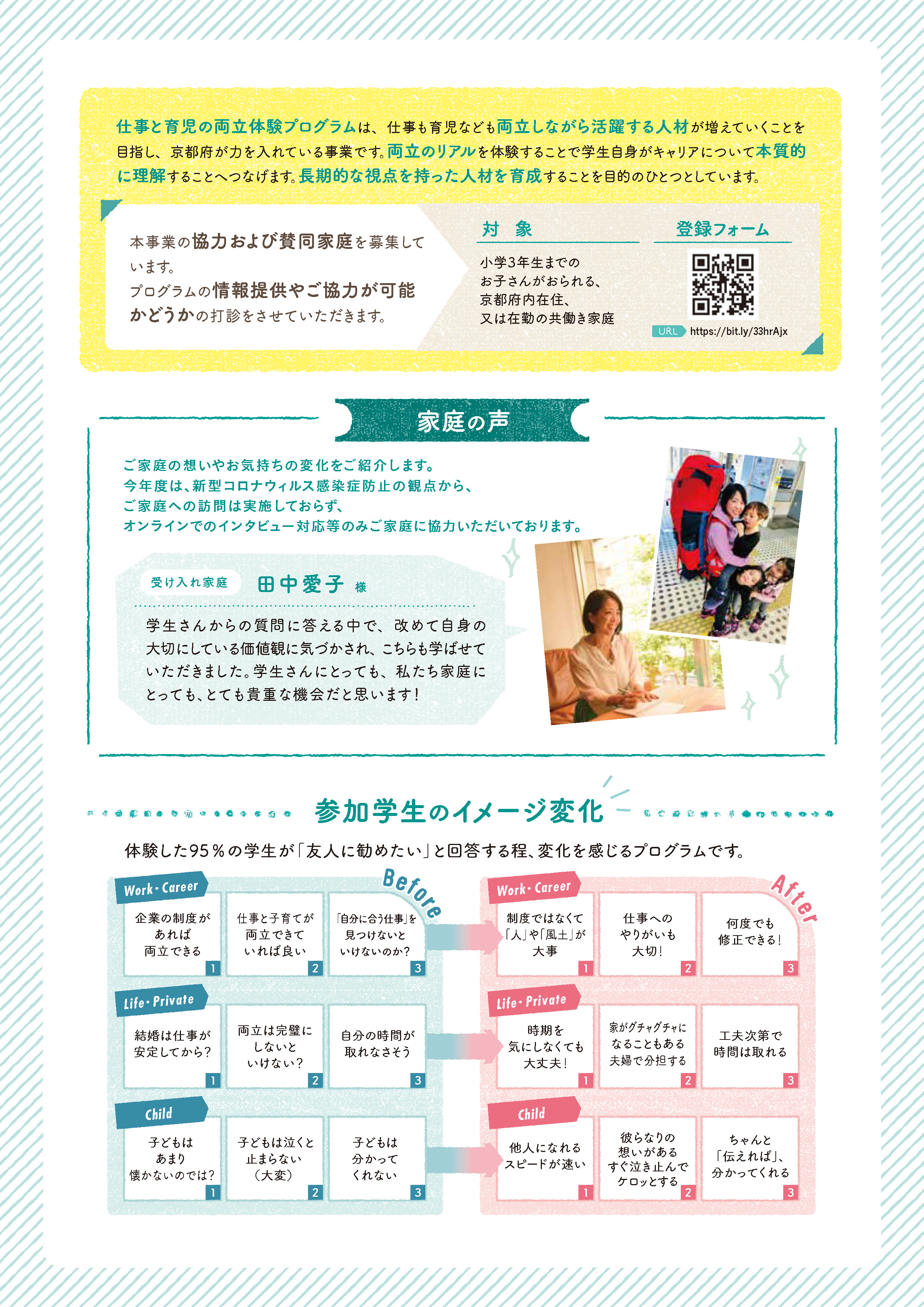 昨年も多くの学生の方にご参加いただいた、京都府主催事業「仕事と育児の両立体験プログラム」にて、仕事と育児のリアルな体験談をお話いただけるご家庭を募集します。
