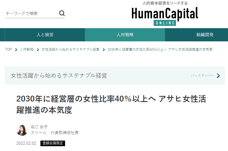 タイトルは、「2030年に経営層の女性比率40%以上へ アサヒ女性活躍推進の本気度」