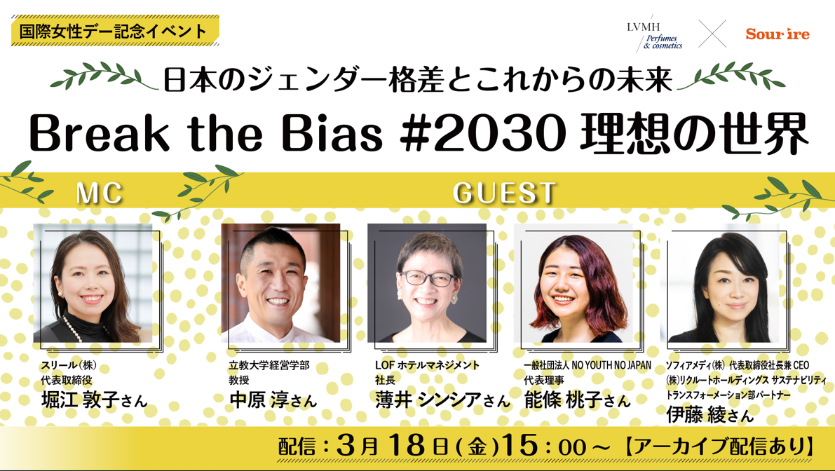 【国際女性デー記念ウェビナー概要】タイトル: Break the Bias #2030理想の世界 ~日本のジェンダー格差とこれからの未来 主催: LVMH Perfumes & Cosmetics、スリール株式会社 ▶お問い合わせ先:. 企業問い合わせフォーム:https://bit.ly/2XcpdMZ |