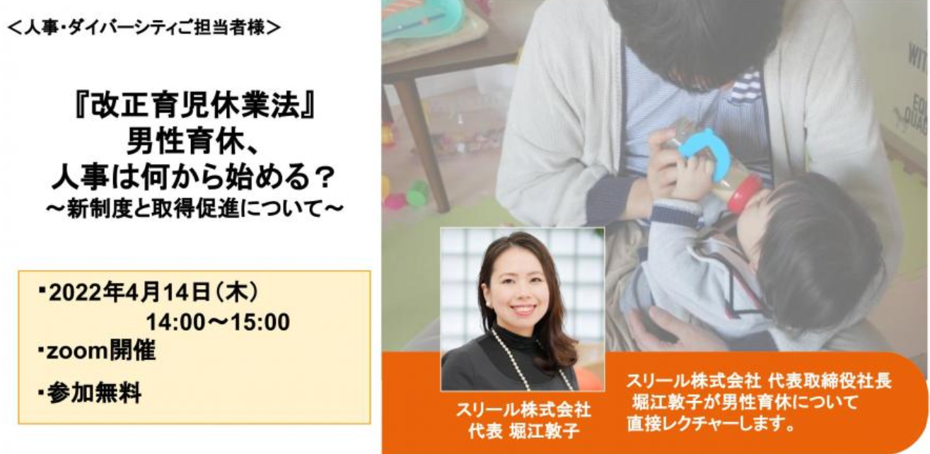 【無料人事向けオンラインセミナー】4/14(木)男性育休、人事は何から始める?〜新制度と取得促進について〜