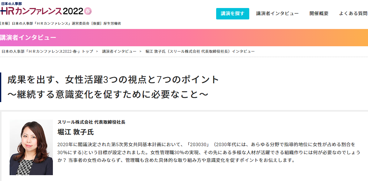 【『HRカンファレンス』堀江登壇セッション概要】タイトル: 成果を出す、女性活躍3つの視点と7つのポイント 日時: 2022年5月25日(水) 9:30〜10:20 参加費: 無料 視聴: オンラインでのライブ視聴 お申込み方法: お申込み締め切り: 5月20日(金)17時