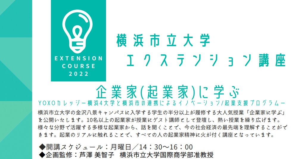 横浜市立大学のエクステンション講座の中でも人気のある授業『企業家(起業家)に学ぶ』に4月18日(月)に堀江が登壇しました。『企業家(起業家)に学ぶ』は、上場企業社長やスタートアップ社長、社会起業家など、組織のリーダーから学べる他、企業における実際の課題や問題、企業と社会の関係について理解を深めることができる授業です。