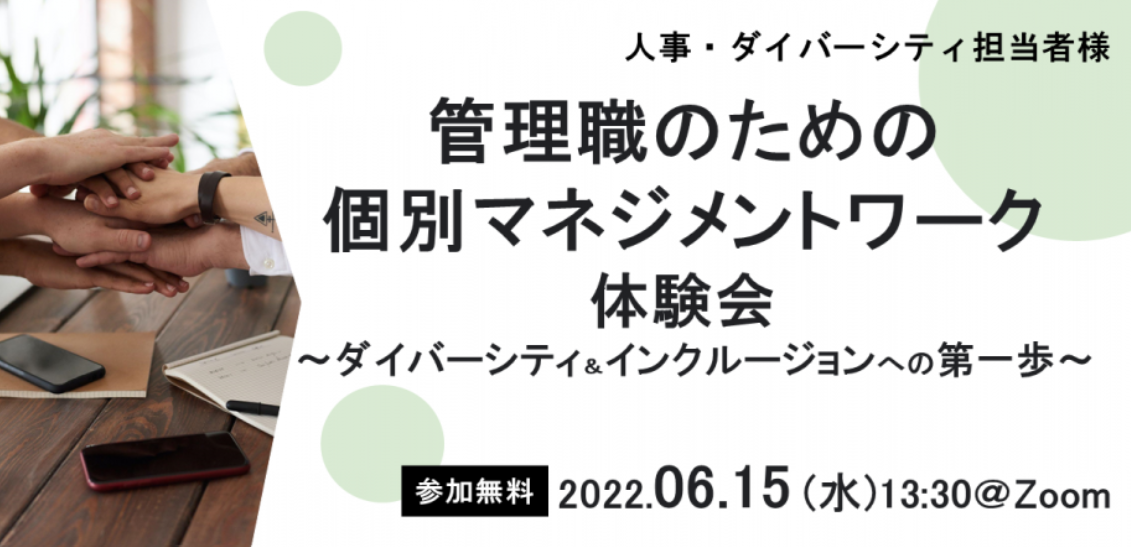人事・ダイバーシティご担当者様から寄せられるお悩みをテーマに解説する、弊社主催・無料人事向けオンラインセミナー。今回は特にお問合せの多い「ダイバーシティマネジメント研修」の内容から特別に、“部下の本心が分かるロープレ”【他社理解ワーク】をご体験いただけます。