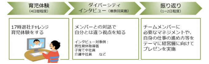 育ボスブートキャンプとは? 「育ボスブートキャンプ」とは、管理職が時間制約のある育児中社員と同様に、時短で仕事を切り上げ、子どものお迎えから食事づくり、子どもとの団らん等一連の育児を一定の期間実践することを通して、多様な人材が活躍するために必要なマネジメントや働き方を考え、組織の在り方を振り返る「育児体験」の他、多様な状況下の社員の声を聞くことで自分とは違う視点を知る「ダイバーシティインタビュー」を盛り込んだ体験型の研修プログラムです。