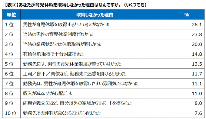 また、育休を取得しなかった理由としては、「男性が育児休暇を取得するという考えがなかった」が最も多く、他に「業務状況的に難しい」といった点が多く挙がっています。