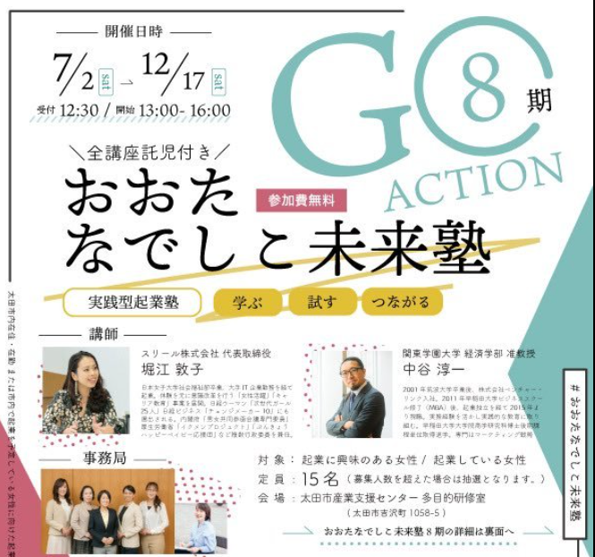 太田市主催の女性起業家育成事業「なでしこ未来塾」が7月から12月まで実践講座全6回で開催します。