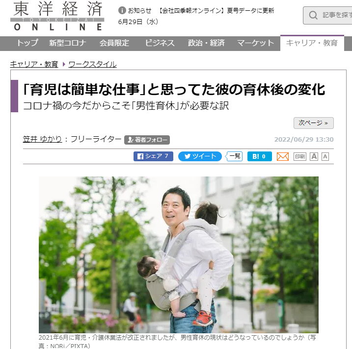 東洋経済オンライン 男性育休をテーマとする記事に、代表 堀江のインタビューが掲載されました。