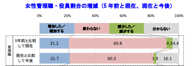 2015年安倍内閣時代に成立した「女性活躍推進法」から7年。帝国データバンクが2020年に発表した調査では、各企業での様々な取り組みがある中でも、自社における女性管理職割合は5年前(2015年)と比較して「変わらない」とする企業が 70%近くという結果でした。また、今後女性管理職の比率が「増加する」と見込む企業は20%程度(いずれも帝国データ・2020年発表値)と、未だ女性管理職比率が国の目標値、かつ、G20平均の30%に達する道筋は険しい状況です。