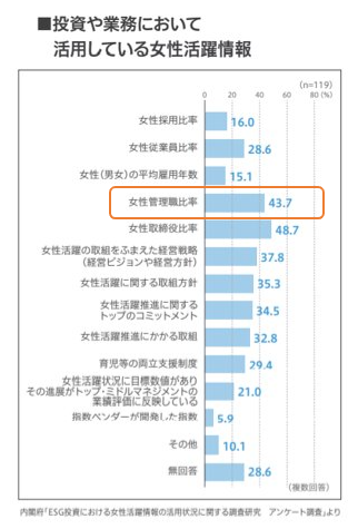 その中でも「女性管理職比率」の値は、およそ半数の投資家に注目されています。(左図参照)