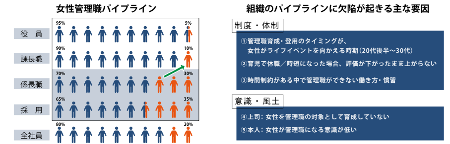 採用~育成~登用まで一貫して人材育成をすることで女性登用のパイプラインを構築し未来の管理職となるプール人材を長期育成することが求められます。