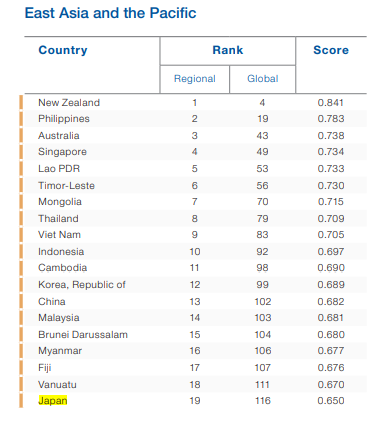 順位は上がりましたが、一つ一つの指標に注目していくとまだ課題が山積しています。 政治、経済分野でも、少しずつ施策が進んできた印象ですが、世界レベルでは平均以下という状況です。 順位の上昇やスコアの少しの上昇に喜びすぎず、でも確かな手応えを持って、本質的な施策を継続して実施していく必要があります。 |