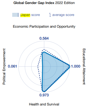 ①経済 ②教育 ➂医療へのアクセス ④政治参加の4つの分野で男女格差が測られるジェンダーギャップ指数の中で、日本は例年通り①経済 ④政治参加の2つの分野でのランキングが世界平均以下でした。※右図参照