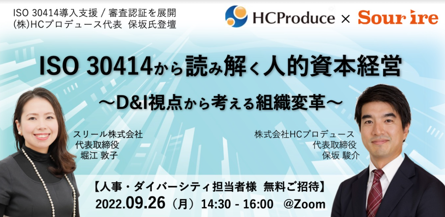 そこで本セミナーでは、ISO 30414導入支援/審査認証機関であるHCプロデュース代表・保坂氏に登壇いただき、人的資本経営に向けた「ISO 30414」の役割、そして、弊社代表・堀江も交えた対談から「ISO 30414」を活用した組織変革についてお伝えしていきます。