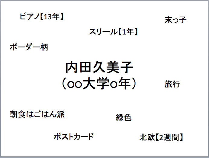 名前のまわりには、自分が好きなことや、続けていること、興味のあることのワードと、それに関わっている年数を書きます。