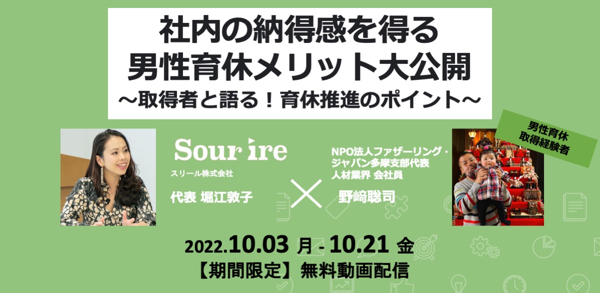 <期間限定アンコール配信!>人事・ダイバーシティご担当者様から寄せられるお悩みをテーマに解説する、弊社主催・無料人事向けオンラインセミナー。10月より施行された、「産後パパ育休(出生時育児休業)」について、育休取得経験者にもご登壇いただきつつ、ポイントを解説していきます。