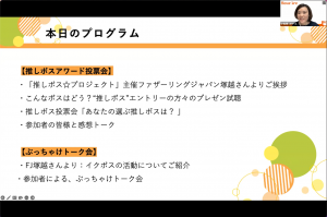 ファザーリング・ジャパン主催の、学生~若手社会人と「働く」送受信を体感するイベント「推しボス☆プロジェクト」をオンラインで視聴し、理想のボス像についてトークし考えるU25限定のイベント「わたしの理想のボスは、こんな人!〜推しボスアワード投票会×ぶっちゃけトーク会〜」を、2022年10月15日(土)10:00〜12:00で開催しました。