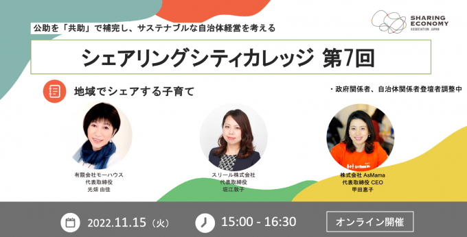 「Co-Society〜シェア(共助・共有・共創)による持続可能な共生社会」をビジョンに掲げ、「心ゆたかな暮らし」(Well-being)と「持続可能な環境・社会・経済」(Sustainability)を実現し、持続可能な共生社会を目指すシェアリングエコノミー協会が主催するシェアリングシティカレッジ~地域でシェアする子育て~(11月15日(火)開催)に代表 堀江が登壇いたします。