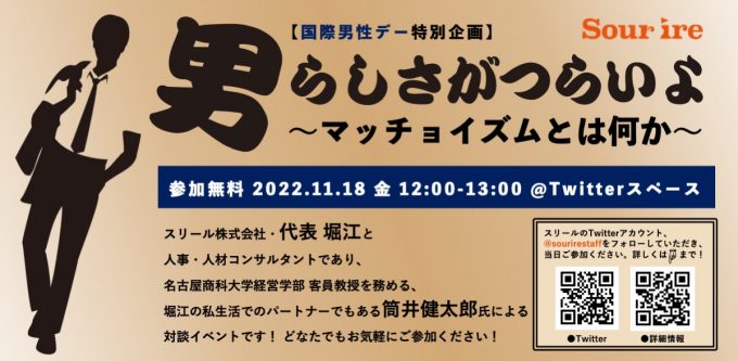 11月18日(金)12時より国際男性デー特別企画として、代表 堀江と人事・人材コンサルタントであり、名古屋商科大学経営学部 客員教授を務める堀江の私生活でのパートナーでもある筒井健太郎の対談をTwitter spaceにて配信します。