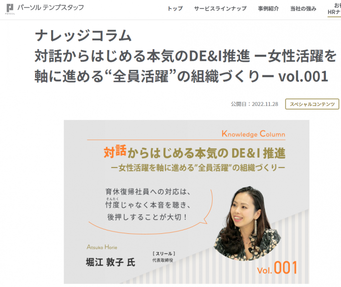 パーソルテンプスタッフ株式会社が運営するWebメディア内『ナレッジコラム』で代表 堀江の連載が始まりました。「これからの女性活躍推進」に向けたメッセージを4回連載予定です。