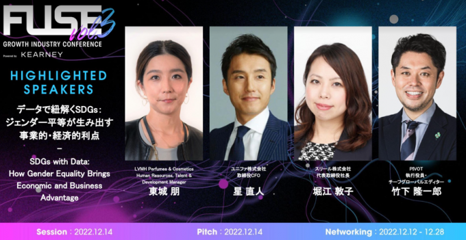 【成長産業カンファレンス『FUSE』堀江登壇セッション概要】タイトル: データで紐解くSDGs:ジェンダー平等が生み出す事業的・経済的利点 日時: 2022年12月14日(水) 11:00〜 @StageA 参加費: 無料(先着5,000名) 登壇者(順不同): 視聴: オンラインでのライブ視聴 お申込み方法: 主催: フォースタートアップス株式会社、CIC Tokyo |