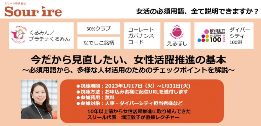 人事・ダイバーシティご担当者様から寄せられる課題やお悩みをテーマに解説する、弊社主催・無料人事向けオンラインセミナー。今回は知っているようで意外と説明が難しい、用語を始めとする女性活躍推進の基本について解説します。