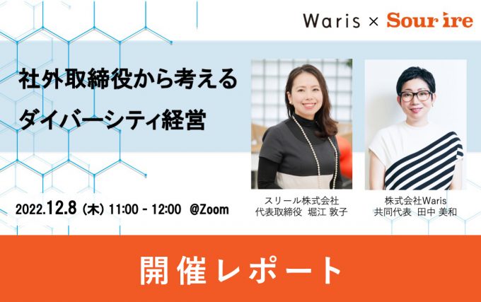 12月8日(木)に株式会社Warisと弊社の共催セミナー「女性社外取締役から考えるダイバーシティ経営〜企業経営多様化実現のヒント〜」を開催しました。今回のセミナーは3部構成。第1部で株式会社Waris共同代表 田中美和さんから「組織を活性化させる本質的な『女性社外取締役』とは」をテーマにご講演いただき、第2部で弊社代表 堀江が「将来に向け社内で進めるべきプール人材の育成」をテーマに講演。最後は2人の代表による対談形式でセッションを行いました。