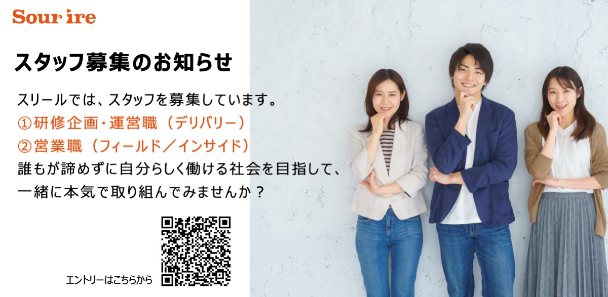 スリールでは、誰もが諦めずに自分らしく働く社会を目指して、弊社で①研修企画・運営職、または②営業職として活躍いただける方を募集します。
