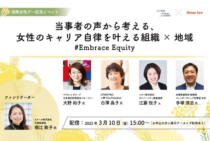 パルファン・クリスチャン・ディオール、ゲラン、パルファム・ジバンシィ、メイクアップフォーエバー等のブランドを有するLVMH Perfumes & Cosmeticsと、スリール株式会社は、多くの割合の女性が従事するサービス、ホスピタリティ業界にフォーカスを置き、働く女性・次世代の女性たちが自律的なキャリアを構築できる環境作りについて考えるウェビナー『当事者の声から考える女性のキャリア自律を叶える組織×地域 #Embraceequity』を3月10日(金)15時~16時半で開催します。