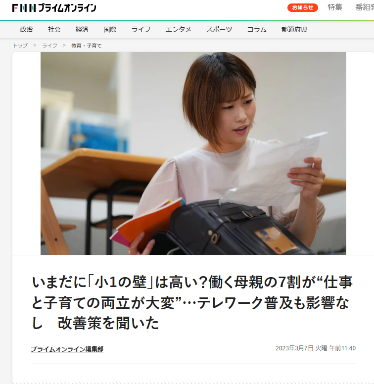 フジテレビジョン運営FNNプライムオンライン(3月7日配信)にて弊社「小1の壁」調査が掲載されました。