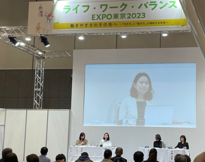 東京都主催、誰もがいきいきと働ける職場環境の実現を目指してライフ・ワーク・バランスについて考えるイベント「ライフ・ワーク・バランスEXPO」に弊社代表 堀江が登壇しました。今回のイベントではご自身もママとして仕事と育児を両立されてきた木佐彩子氏がファシリテーターを務め、株式会社ポーラ 執行役員・人事戦略部長 荘司祐子氏、清水建設株式会社 人事部ダイバーシティ推進室長 西岡真帆氏、弊社代表 堀江の3名が「女性が管理職を目指したくなる職場環境/制度とは?」というテーマの下、パネルディスカッションを行う形式で開催されました。