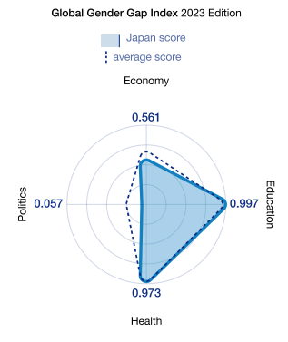 ①経済 ②教育 ➂医療へのアクセス ④政治参加の4つの分野で男女格差が測られるジェンダーギャップ指数の中で、日本は例年通り①経済 ④政治参加の2つの分野でのランキングが世界平均以下でした。※右図参照
