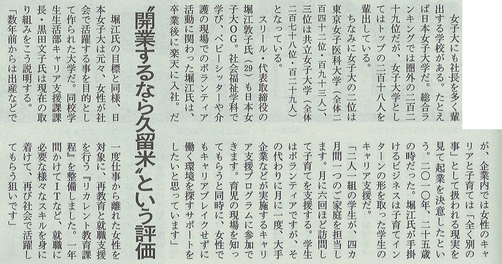 「社長の出身大学」という特集記事で、女子大の中で社長輩出数トップの日本女子大学OGとしてご紹介いただき、堀江自身の起業までのエピソードと、「ワーク&ライフ・インターン」事業についてお話しいたしました。
